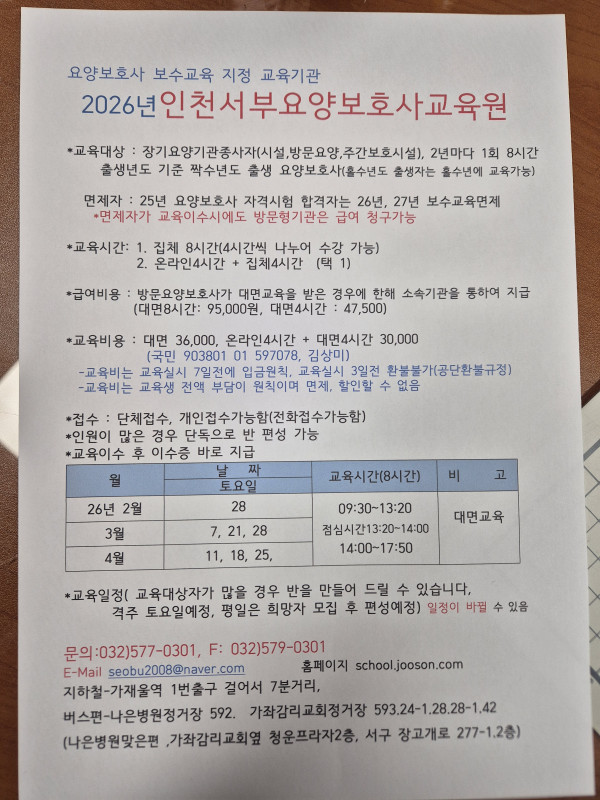 2026년 보수교육 시작합니다(2월,3월4월 교육계획) 작성자 정보 깡미 작성 작성일 2026.01.15 15:26 컨텐츠 정보 1 조회 목록 본문 2026년 보수교육 일정이 나왔습니다2월, 3월,4월 교육계획 입니다온라인으로도 신청 가능합니다 SNS 공유 관련자료 이전 2026년 교육개강 안내합니다 (주간반 2/4일, 2026년 야간반 1/26일 개강) 사정에 따라 바뀔 수 있습니다 작성일 2026.01.15 15:37 다음 심폐소생술 시연장면(130기훈련생들) 작성일 2025.11.03 11:26 댓글 0 등록된 댓글이 없습니다. 로그인한 회원만 댓글 등록이 가능합니다. 목록